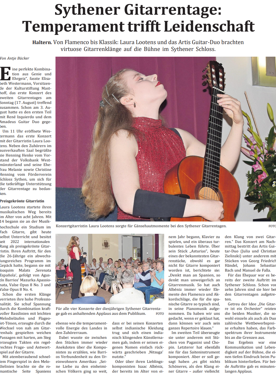 Für das Duo war der Auftritt ein Erfolg, für die Veranstalter und das Publikum ein Beleg, mit welch künstlerischer Qualität – selbst bei spontanen Musikerwechseln - die Sythener Gitarrentage, die es immerhin seit 15 Jahren gibt, aufwarten.